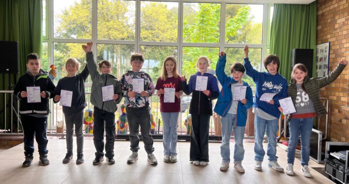 Die Klassen 4a und 4b haben am 19. März erfolgreich am Känguru der Mathematik-Wettbewerb teilgenommen. Känguru der Mathematik – das ist ein Wettbewerb, der einmal jährlich am 3. Donnerstag im März in allen Teilnehmerländern gleichzeitig stattfindet, ein mathematischer Multiple-Choice-Wettbewerb für rund 6 Millionen Teilnehmer in über 100 Ländern weltweit! Die Köpfe unserer Schülerinnen und Schüler rauchten ordentlich und alle hatten Spaß am Knobeln. In dieser Woche gab es die Ergebnisse und alle Teilnehmenden erhielten Preise, Urkunden und ein Heft mit Knobel-Aufgaben. Auf dem Bild seht ihr die Kinder, die die ersten 10 Plätze belegt haben (von links nach rechts): Furkan, Lasse, Moritz, Jim, Antonia, Rosa, Luke, Max, Clara. Nicht auf dem Bild ist Sarah.